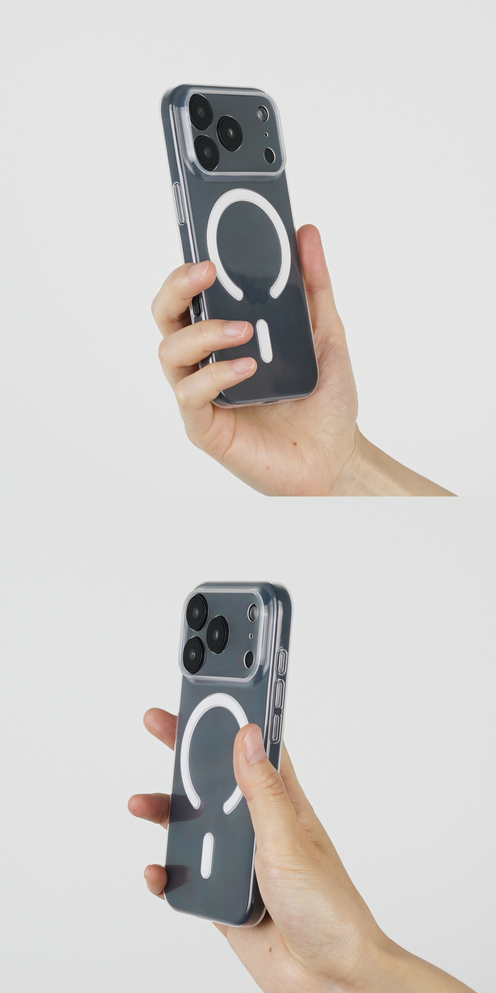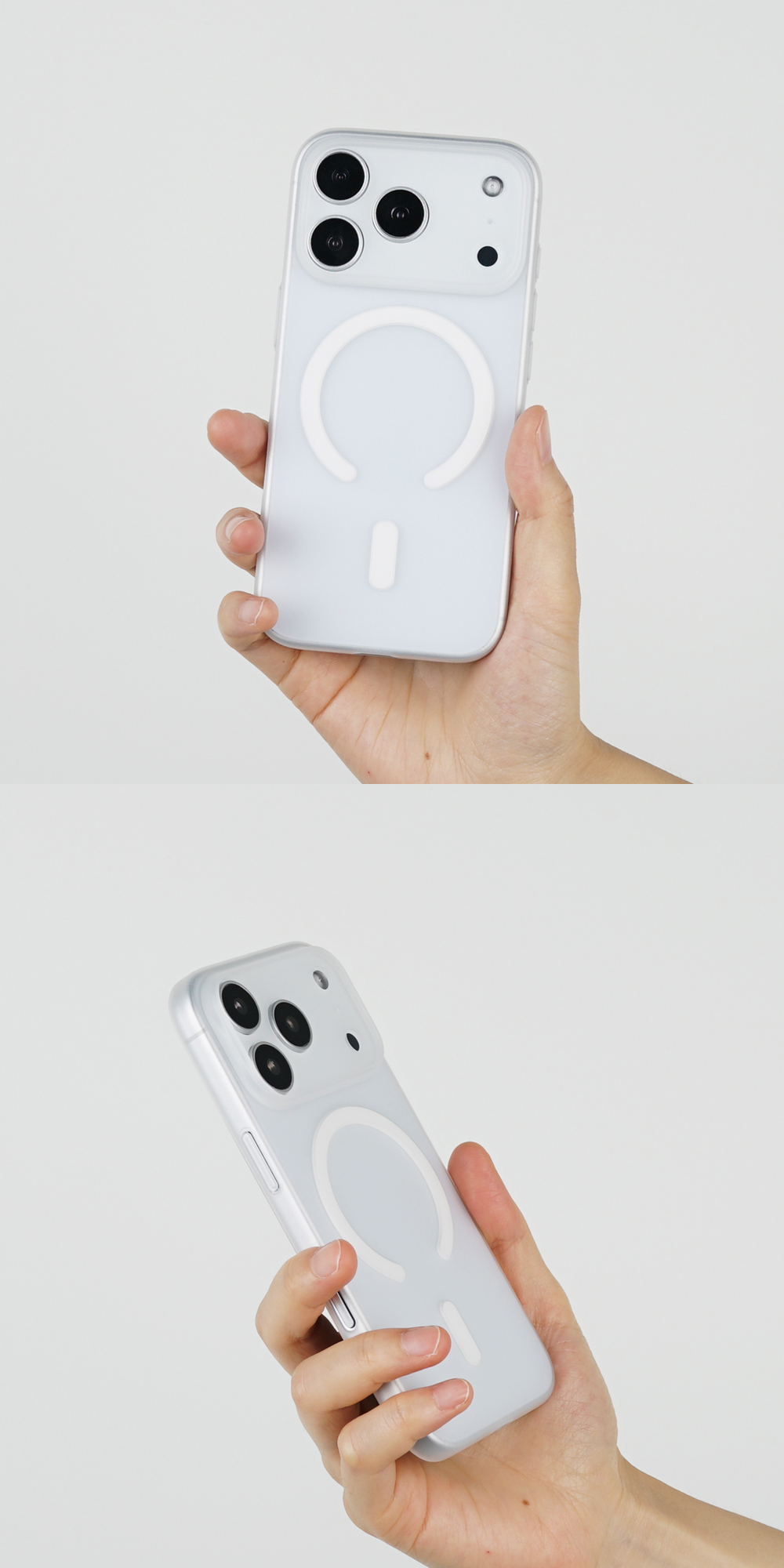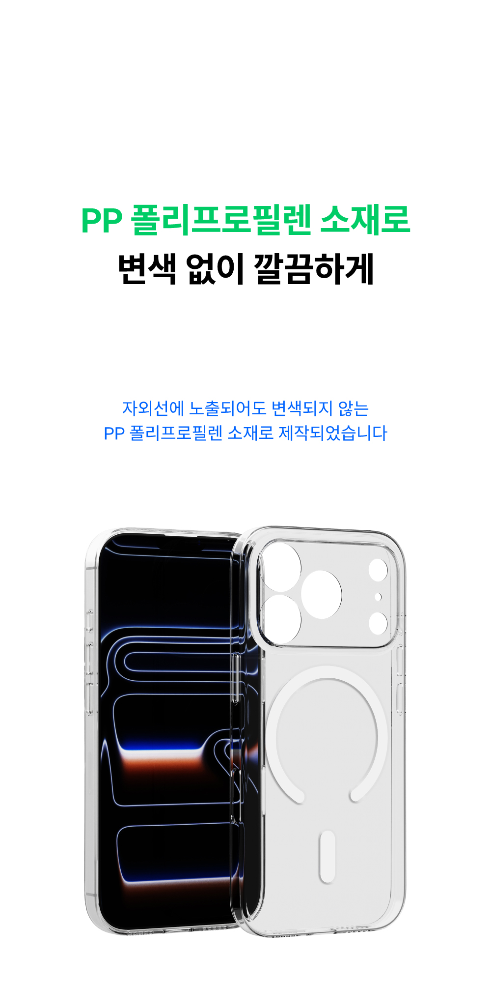 PP 폴리프레폴린 소재의 반투명 케이스입니다. 투명도는 약 50-70%이며, 소재 특성상 변색되지 않고 유막현상이 없으며 세균번식이 적어 위생적입니다. 케이스 두께만큼 아이폰과 단차를 두고 카메라 풀커버로 설계되어 카메라와 액정을 보호합니다. 무선 및 맥세이프 충전을 지원합니다.