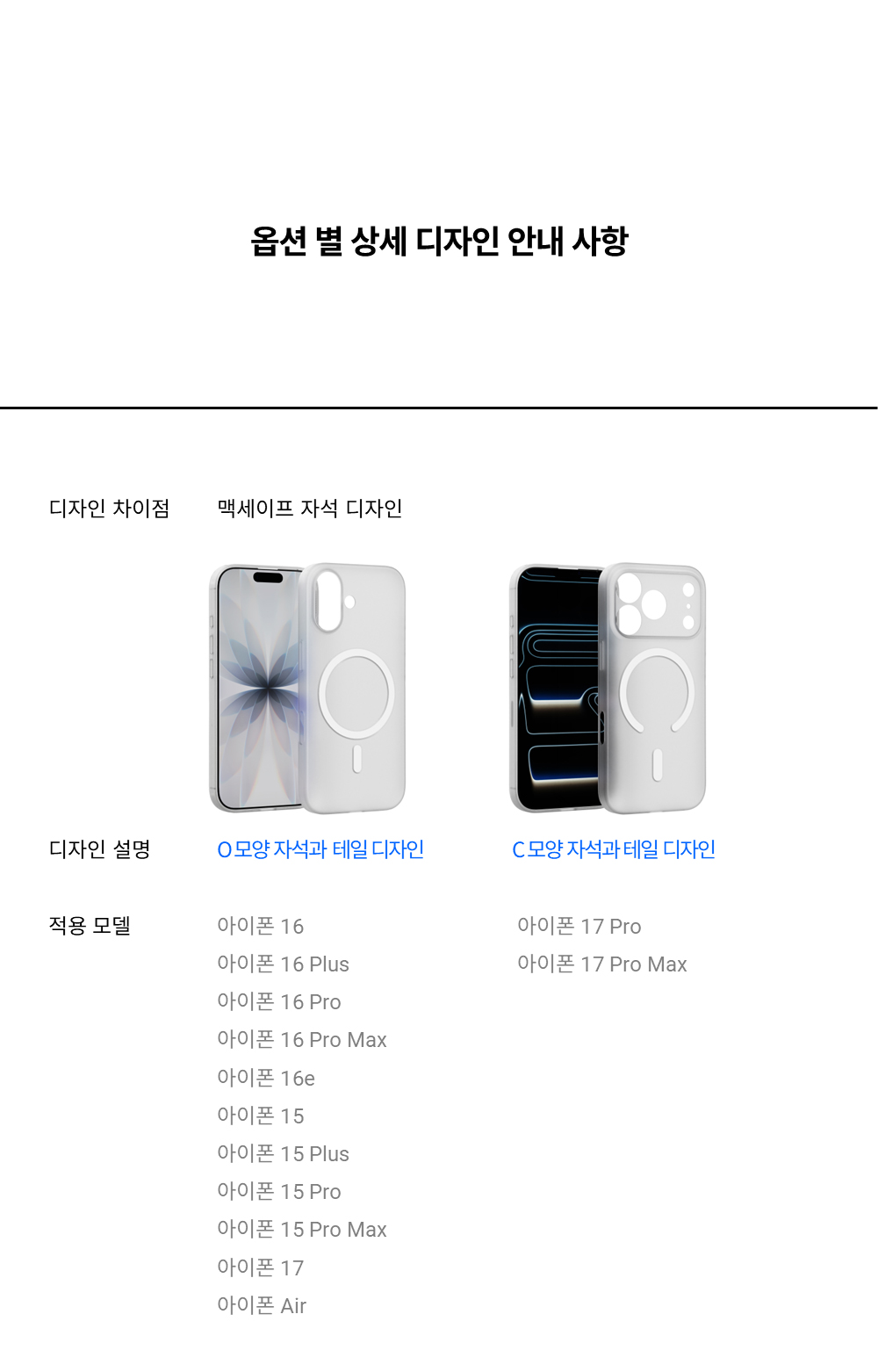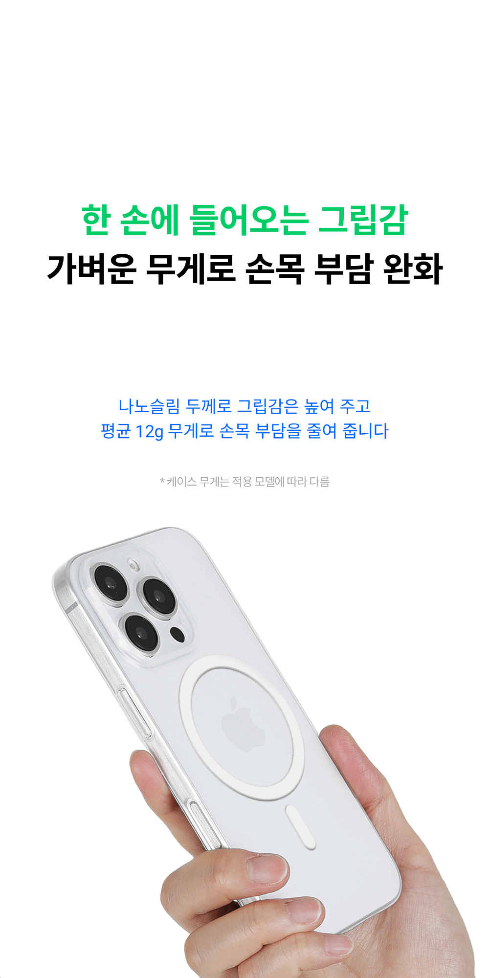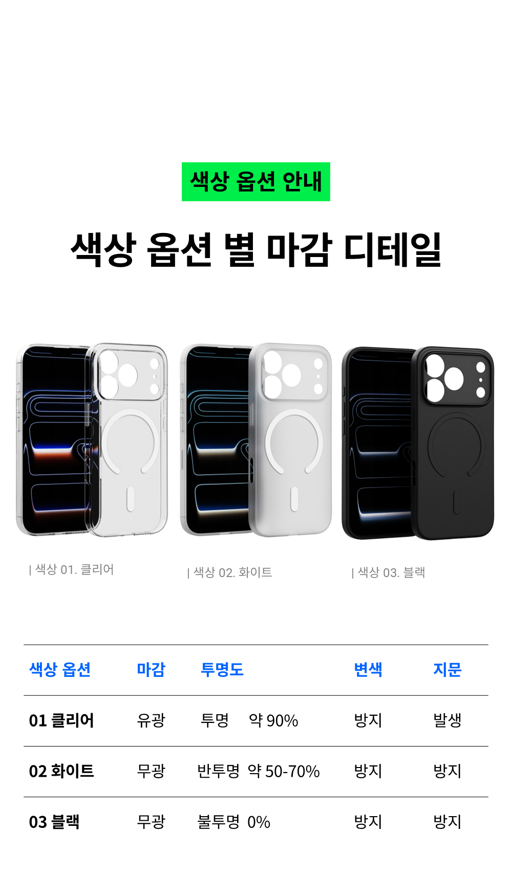 PP 폴리프레폴린 소재의 반투명 케이스입니다. 투명도는 약 50-70%이며, 소재 특성상 변색되지 않고 유막현상이 없으며 세균번식이 적어 위생적입니다. 케이스 두께만큼 아이폰과 단차를 두고 카메라 풀커버로 설계되어 카메라와 액정을 보호합니다. 무선 및 맥세이프 충전을 지원합니다.
